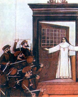 No assalto ao convento, desde o exterior, já os gritos dos soldados eram ouvidos no interior, tendo imediatamente a Abadessa, pressentindo certamente objectivos da profanação da castidade de suas internas, ordenado que as monjas fugissem pelo quintal.