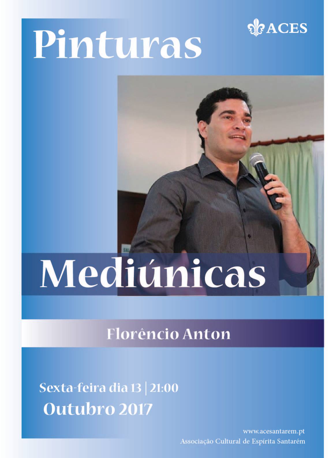 Abril 22, 2026 by « Todos os Eventos Este evento já decorreu. 13 Outubro - Palestra de Pintura Mediunica por Florêncio Anton Outubro 13, 2017 @ 21:00 - 22:00 « 29 Setembro - Palestra Doutrinária com Geraldo Campetti Sobrinho Palestra Doutrinária por Miriam Masotti » Adicionar ao calendário Calendário Google iCalendar Outlook 365 Outlook Live Detalhes Data: Outubro 13, 2017 Hora: 21:00 - 22:00 Categoria de Evento: Pintura Mediunica Etiquetas de Evento:2017, ACES, Associação Cultural Espirita de Santarém, divulgação, Espiritismo, estrada de damasco, Florêncio Anton, Pintura mediunica, santarém Local ACES