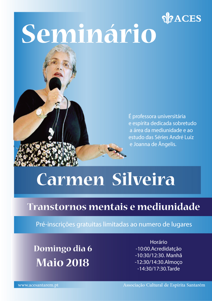 Abril 22, 2026 by « Todos os Eventos Este evento já decorreu. Seminário Carmen Silveira Transtornos Mentais e Mediunidade Maio 6, 2018 @ 10:00 - 17:30 « Palestra Doutrinária por Marco Maiuri Miranda 17 Maio - Pintura Mediúnica por Florêncio Anton » Adicionar ao calendário Calendário Google iCalendar Outlook 365 Outlook Live Detalhes Data: Maio 6, 2018 Hora: 10:00 - 17:30 Etiquetas de Evento:associação, carmen, cultural, espírita, Espiritismo, mediunidade, mentais, santarém, seminário, Silveira, Transtornos Local ACES