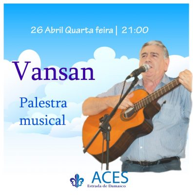 Abril 22, 2026 by « Todos os Eventos Este evento já decorreu. Momento Musical por Vansan Abril 26, 2017 @ 21:00 - 22:00 « 160 anos - Livro dos Espíritos Palestra Doutrinária por Merlânio Maia » Assista em directo no nosso site ao Momento Musical com Vansan http://acesantarem.pt/em-directo/ Adicionar ao calendário Calendário Google iCalendar Outlook 365 Outlook Live Detalhes Data: Abril 26, 2017 Hora: 21:00 - 22:00 Categoria de Evento: Palestras Etiquetas de Evento:2017, ACES, divulgação, Espiritismo, estrada de damasco, Palestra Musical, santarém, Vansan Local ACES